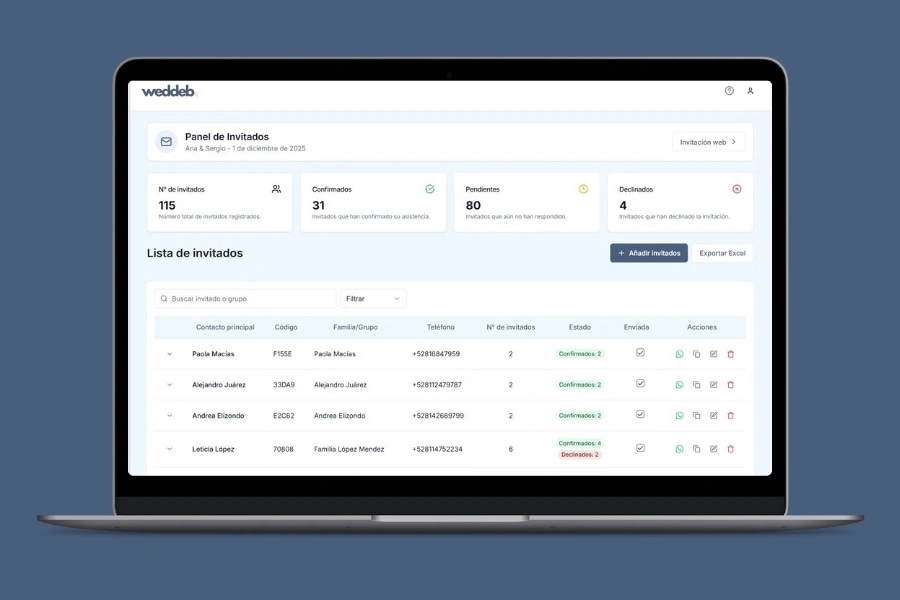 Además, con el Panel de Invitados podrás dar de alta a tus invitados, enviar la invitación por WhatsApp o redes sociales y recibir confirmaciones en tiempo real.