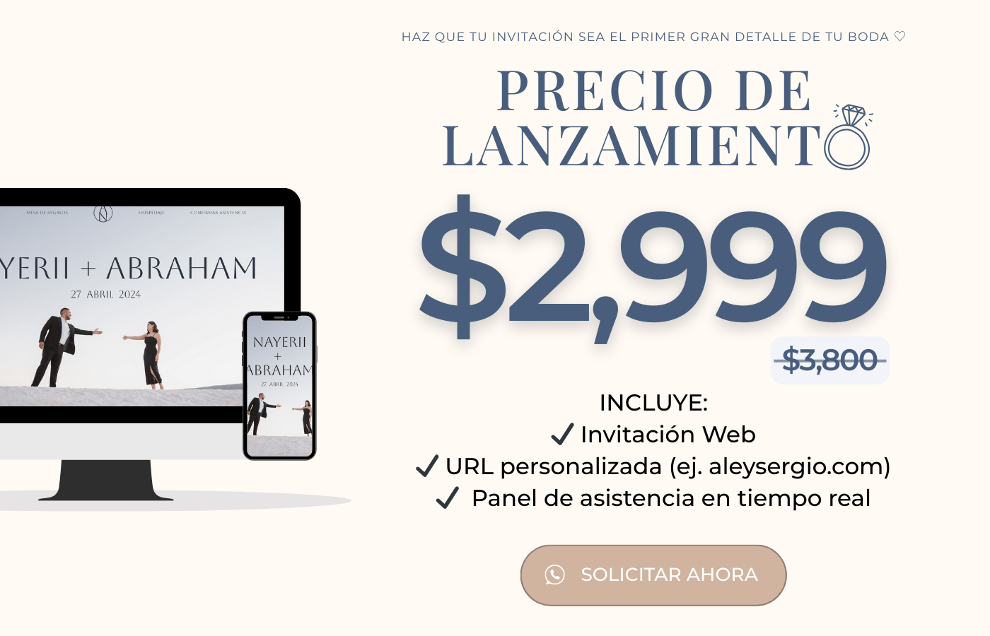 Incluye subdominio (ej. weddeb.com/boda-alondra-felix)
